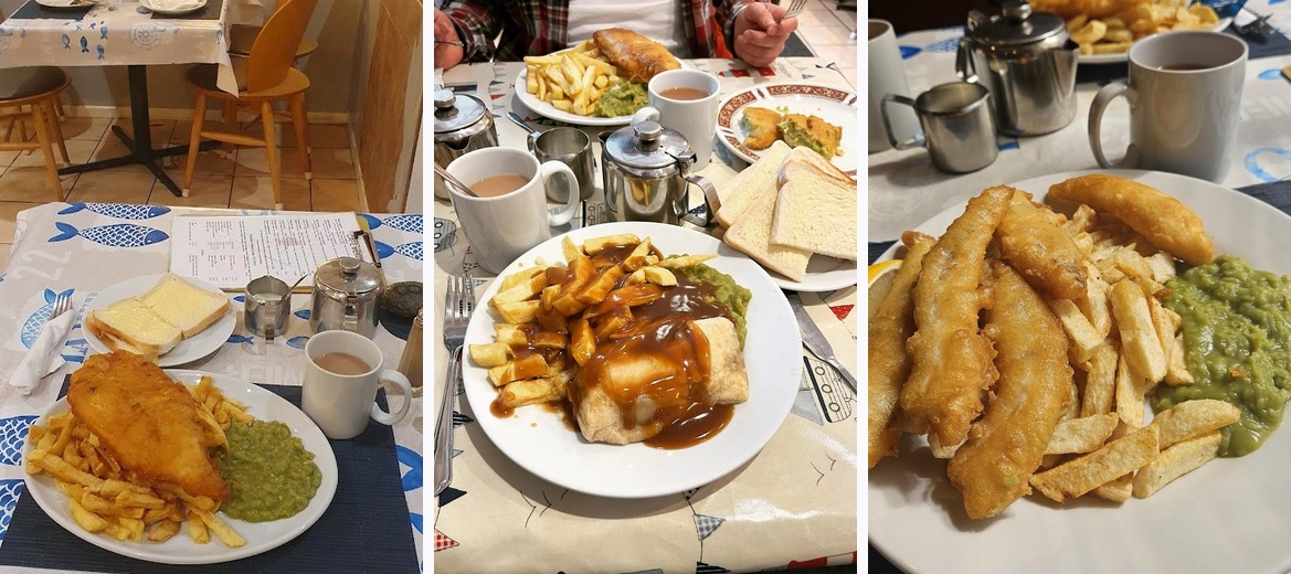 A quaint and homely atmosphere suitably themed by the decor. Service is exceptional very quick. Portions are generous and food of the highest quality. The largest fish on the menu, chips, peas, two slices of bread and butter, coffee or tea with a free refill is £12 (AKA the Neptune Meal). Unbeatable.